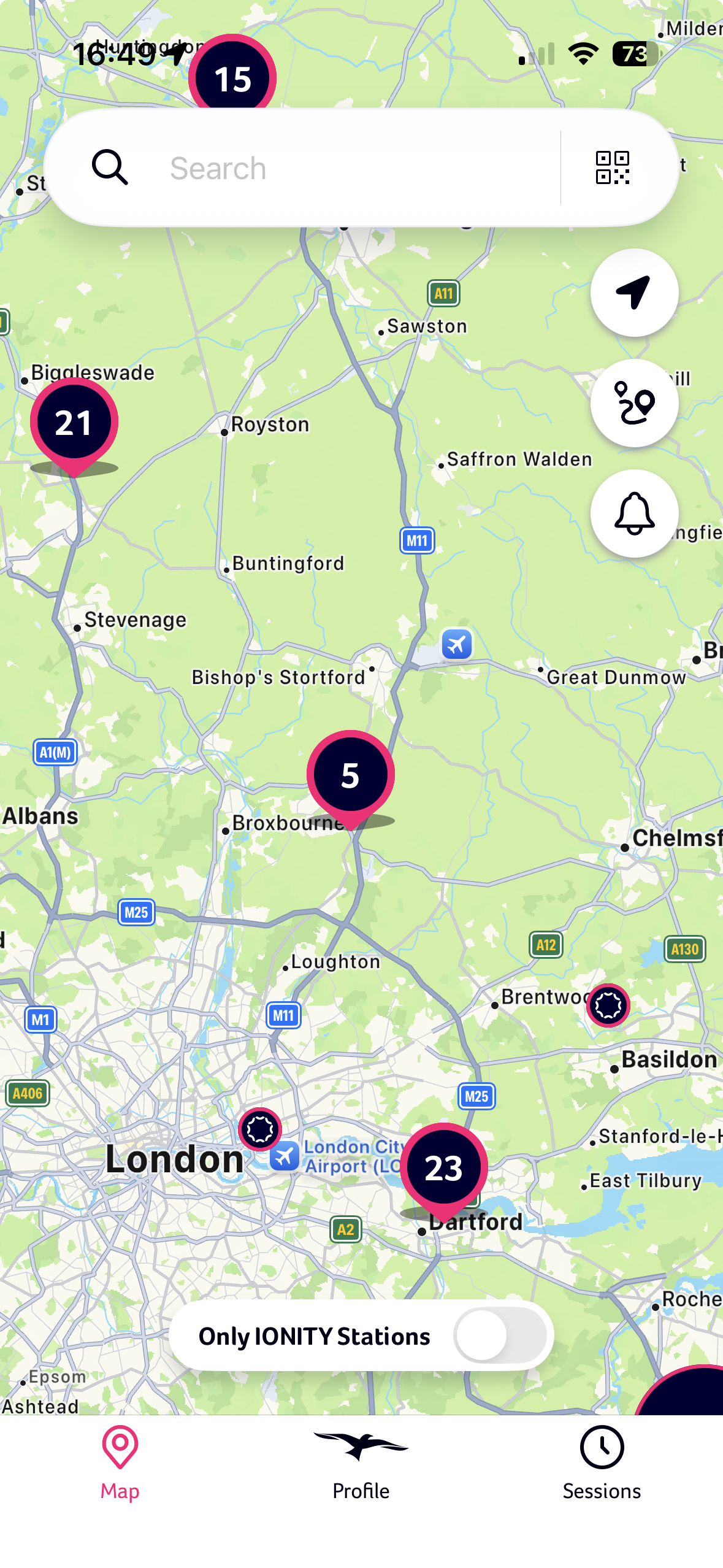 1. Öffnen Sie die IONITY-App auf Ihrem Mobiltelefon und wählen Sie auf der Karte die Ladestation aus, an der Sie sich gerade befinden. Wenn Sie der App die Verwendung Ihres Standorts gestattet haben, wird die richtige Ladestation angezeigt, gekennzeichnet durch ein Symbol (Kreis mit der Anzahl der verfügbaren Ladegeräte). Sie können auch den QR-Code-Leser verwenden, indem Sie auf das Symbol in der rechten oberen Ecke der Suchleiste klicken. Den QR-Code finden Sie auf jedem unserer Ladegeräte in der Nähe des Displays. Scannen Sie einfach den QR-Code auf dem Ladegerät und das entsprechende Ladegerät wird geladen. Sie können die nächsten beiden Schritte überspringen und direkt mit Schritt 4 fortfahren. Alternativ können Sie nach einer Station suchen, indem Sie den Standort in das Suchfeld eingeben und die richtige Station auf der Karte auswählen.